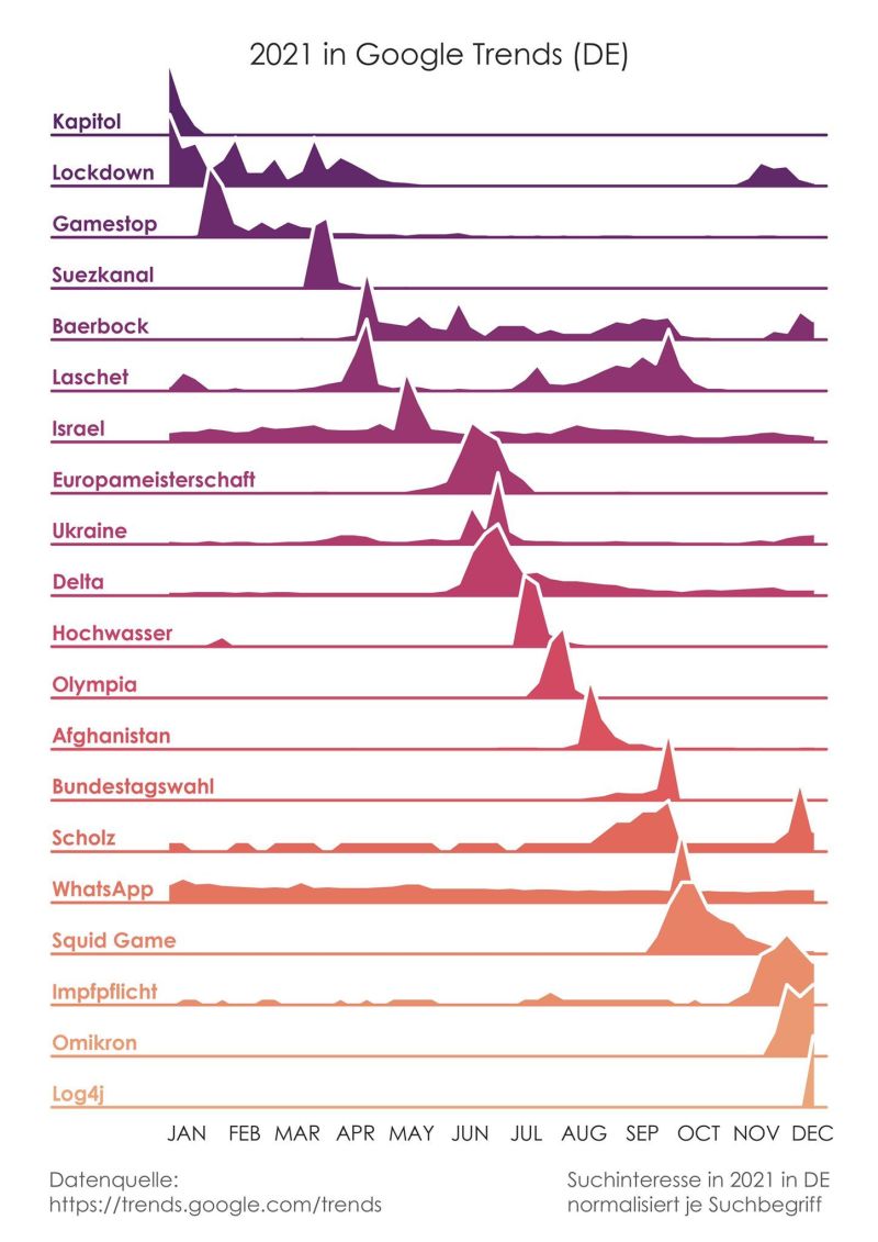 Das Jahr 2021 neigt sich dem Ende. Um es zusammenzufassen bin ich im Internet über die folgende Grafik gestolpert. Der Autor ist mir leider nicht bekannt. Es ist wirklich faszinierend, wie gut das Jahr alleine durch die Suchanfragen beschriebe werden kann.
